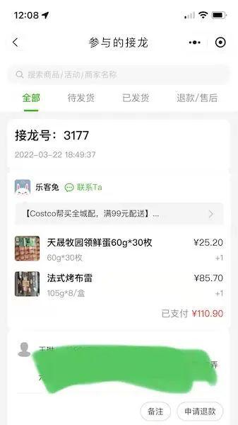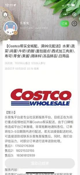 圖説:微信羣聊申請退款,還要等待與此同時,還有其他多位市民反映,朋友圈被這則「接龍買菜」刷爆。人們一開始紛紛轉發,后來變得疑慮重重。記者詢問了多位下單付款的市民,他們的態度各有不同。有的表示理解,「可能活動太火爆了,一下子超出了活動方的承受範圍。估計消化訂單所需時間會有所延長。我買的菜還沒送到,就再等等吧。」還有的提出疑問,「活動方失聯,我們付的錢怎麼辦?」為此,他們還致電開市客,但電話都沒能接通。還有的市民不願在猜測中等待,於是申請退款。記者瞭解到,提出申請較早的市民都已經順利退到了款;而目前如申請線上退款,則會收到這樣的反饋:需3—5個工作日。電話忙音,微信難加3月23日中午,記者打開「接龍買菜」的鏈接。頁面顯示,活動已於3月22日22時19分結束,參與人數有12228人,活動門檻是「滿99元配送」。記者發現,小程序鏈接上的上架商品,有各種蔬菜、水果,雞蛋牛奶等。活動方名稱是「樂客兔」,為一家社區新服務平臺,打出的活動名稱是「Costco幫買全城配」。頁面中有一則通告:由於口碑相傳造成平臺訂單激增。非常抱歉地通知各位,訂單將在3—5日期限內進行配送,若無法接受配送時間,可直接退款或聯繫樂客兔。記者撥打頁面上的3個手機號碼,始終是忙音;添加客服微信,顯示「操作過於頻繁,請稍后再試」。記者又輾轉問到開市客上海閔行店的電話,但一直無法撥通。「樂客兔」到底怎麼了?對此,不少市民也理性表示,或許活動方遭遇「意外爆單」,應該多給些處置時間。但他們也希望活動方及時暢通聯繫渠道、發佈通告,給予消費者應有的迴應。對此,記者將繼續關注。