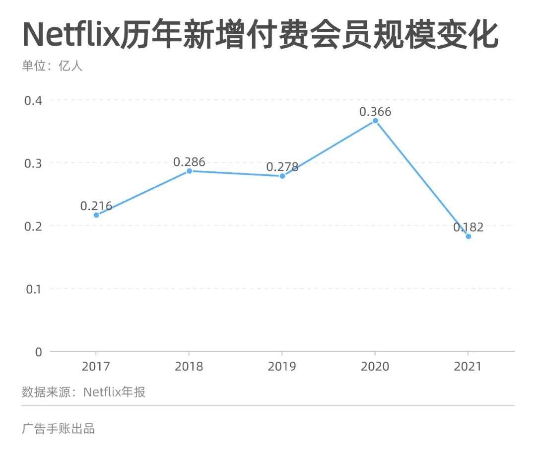 比如流媒體收入增速逐年下滑,從2018年的37.28%下降到2021年19.22%:付費會員規模年增率也從26.26%收窄至11.64%;另外,每年新增付費會員也出現了下滑,從2020年的3660萬下降到了去年的1818萬。