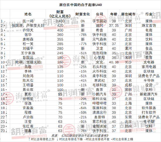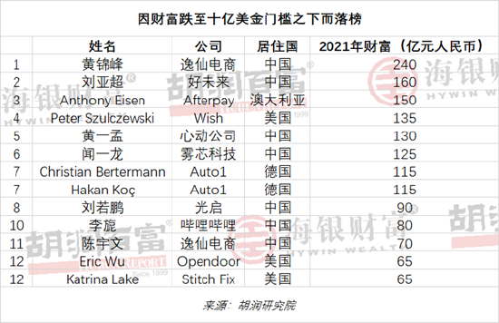 13位因財富跌至十億美金門檻之下而落榜,另有10位年滿41歲而退出榜單。完美日記39歲的黃錦峰是落榜者中去年財富最高的,240億元。