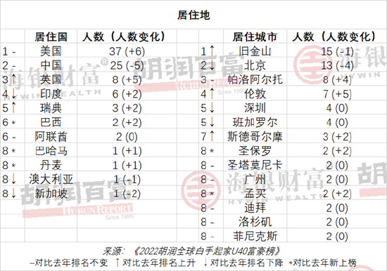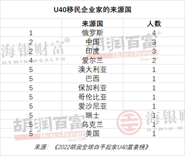 胡潤全球U40企業家中,20位是移民。他們目前居住在美國(8位)、英國(7位)和阿聯酋(2位),而他們主要來自俄羅斯,其次是中國、印度和愛爾蘭。
