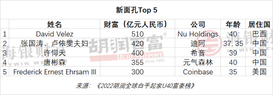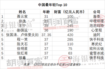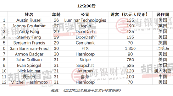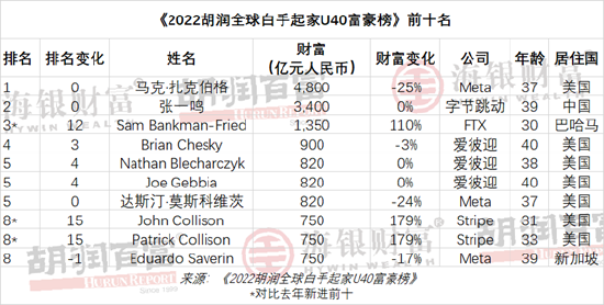 《2022胡潤全球白手起家U40富豪榜》前十名