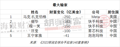 從財富下降的數額來看,最大輸家是Meta 37歲的馬克·扎克伯格,減少了近2,000億元,其后四位下降最多的都來自中國,快手40歲的宿華和37歲的程一笑分別減少了1,000億元左右,悦刻40歲的汪瑩減少了600多億元,泡泡瑪特35歲的王寧減少了近300億元。