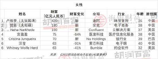 7位女性上榜,以來自中國的DR鑽戒35歲盧依雯為首。美國交友軟件Bumble 32歲的Whitney Wolfe Herd是全球最年輕的白手起家十億美金女企業家。