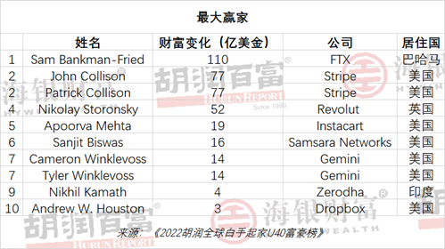 從財富增長的數額來看,最大贏家是加密貨幣交易所FTX 30歲的Sam Bankman-Fried,增長了700億元;其次是美國在線支付平臺Stripe 31歲的約翰·科里森和33歲的帕特里克·科里森,分別增長了500億元。