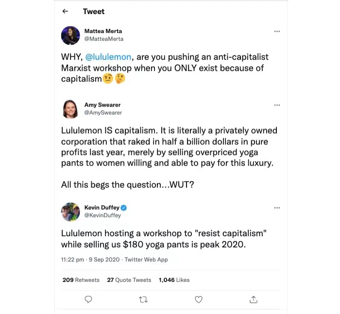 在「始作俑者」Chip Wilson離開企業之后,Lululemon或許意識到了這種「不兼容性」(Incompatibility),該品牌於2020年9月舉辦的「抵制資本主義」(Resist Capitalism)活動便是其嘗試統一正念價值體系的佐證。不過,這一行為再次讓品牌面臨嚴厲譴責。