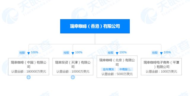 天眼查APP顯示,瑞幸咖啡(中國)有限公司於2018年3月成立,法定代表人郭謹一,註冊資本18億美元,由瑞幸咖啡(香港)有限公司全資持股。目前該公司對外投資近60家公司,多數為瑞幸在全國各地成立的子公司,同時也包括瑞幸商務管理(北京)有限公司、中建大唐建築(深圳)有限公司等。瑞幸在各地的子公司中,多家擁有上百家門店。
