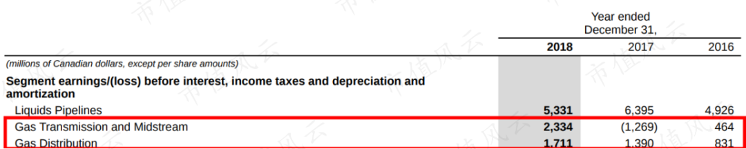 這直接讓公司的天然氣業務從原來的小老弟提升到了跟原油管道接近的盈利規模。2018年,天然氣輸送和中游業務EBITDA 23.3億加元,天然氣銷售17.1億加元,合計40.5億加元,接近原油管道的53.3億加元。
