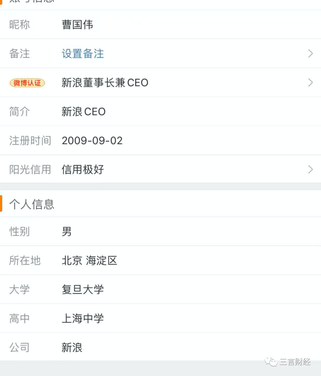 新浪CEO曹國偉的IP屬地不顯示。