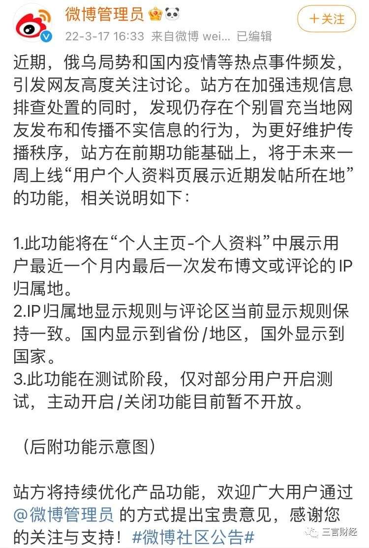 在微博的公告中,明確說明了此功能是爲了加強對俄烏局勢和國內疫情等熱點事件的不實信息的排查處置。並説明此功能將在「個人主頁-個人資料」中展示用户最近一個月內最后一次發佈博文或評論的IP歸屬地。