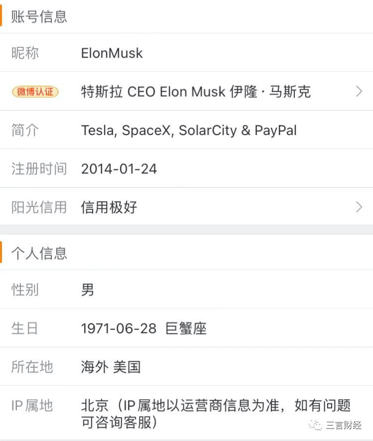 三言財經還發現,特斯拉CEO埃隆·馬斯克的IP屬地是北京。