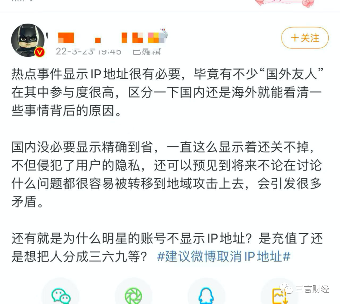 該網友還對明星的賬號不顯示IP地址表示質疑:「是充值了還是想把人分成三六九等?」