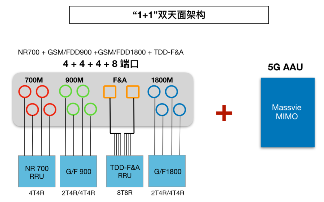 這樣一來,新增NR 700M頻段后,可以通過一個4448天線收編所有NR 700M、GSM900、FDD900、GSM1800、FDD1800和TDD-FA,並與支持2.6G 160MHz寬頻的AAU形成「1+1」雙天面架構。