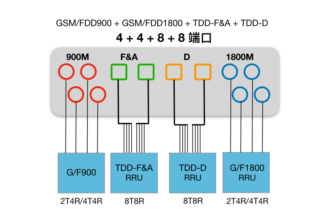 4448天線,指支持700M、900M、1800M和FA頻段的多頻段天線,4端口支持700M、4端口支持900M、4端口支持1800M、8端口支持FA頻段。其中,NR 700M頻段支持4T4R,TDD-FA支持8通道天線,對於共享4天線通道的GSM900/FDD900或GSM1800/FDD1800,GSM和FDD可通過分享天線通道各佔2通道,FDD開啟2T2R,后期GSM退網后,還能升級到FDD 4T4R。
