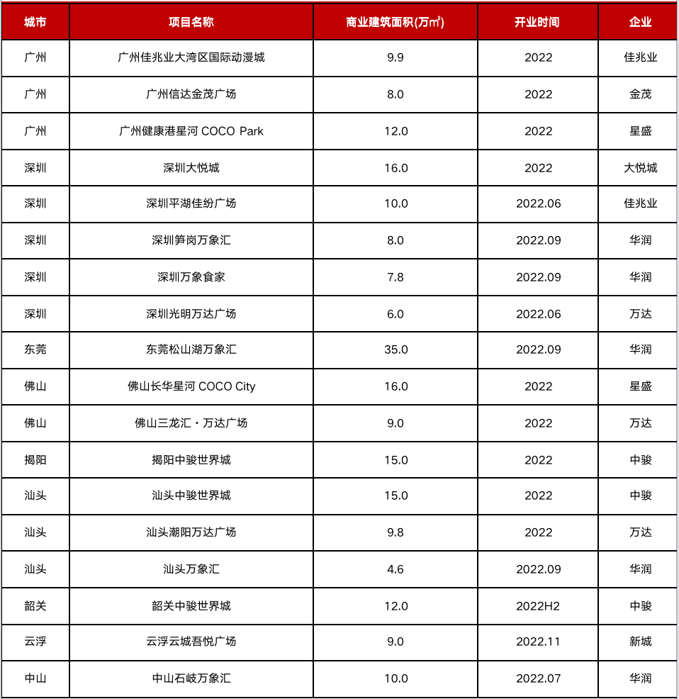 從2022年擬開業項目情況來看,即便現有項目「水土不服」,房企依然沒有停下對珠三角的探索。中駿、新城、萬達在企業戰略定位的導向下,向汕頭、韶關、雲浮等更低能級城市進駐,而對於金茂、大悦城等首入珠三角的房企來説,廣深依然是最安全的選擇。