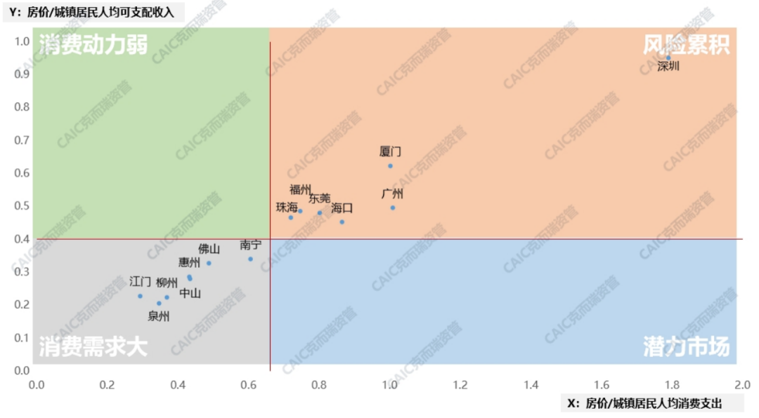 房價占人均可支配收入越高,房價與人均消費支出佔比越高,意味着房產消費對商業消費產生了抑制作用。對珠三角及周邊城市數據分析來看,對於商業地產投資來説,深圳等高能級城市房價對消費抑制的風險正在累積,而低能級的消費需求仍需要進一步釋放。