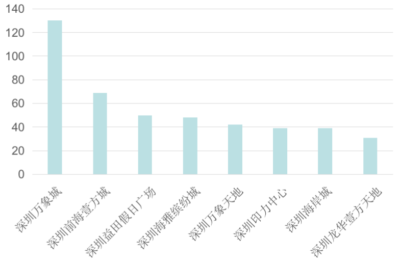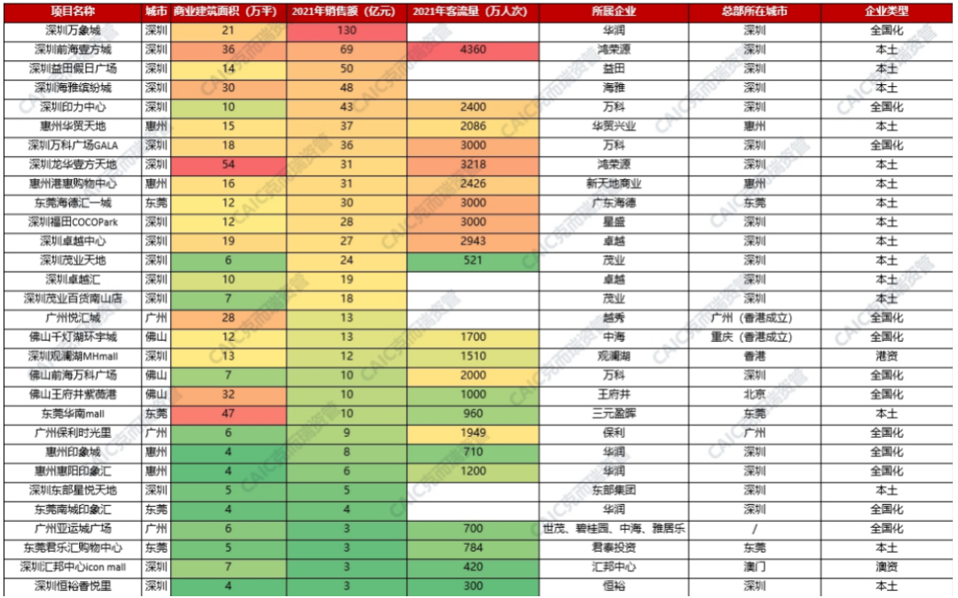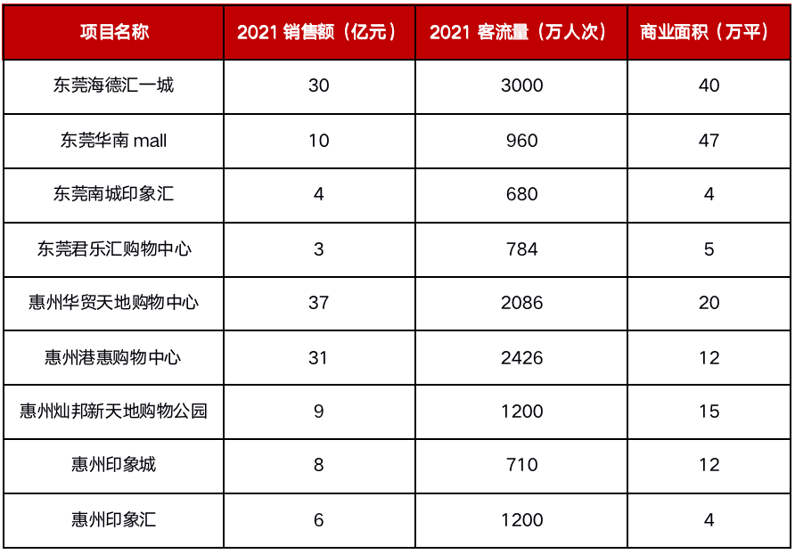 東莞惠州標杆級項目則較少。2021銷售額百強項目排名中,惠州華貿天地購物中心以36.5億銷售額位列第52位,惠州港惠購物中心以31億銷售額位列第58位,東莞海德匯一城以30億銷售額位列第71位。