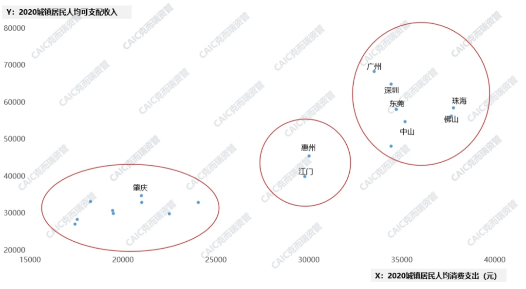 廣州、深圳、東莞等城市組團的人均可支配收入、人均消費支出也很高,屬於「有錢肯花」的城市,消費旺盛,商業發展潛力足。而肇慶等低能級城市消費水平則顯著較弱決定了在這些城市做商業的風險和天花板。