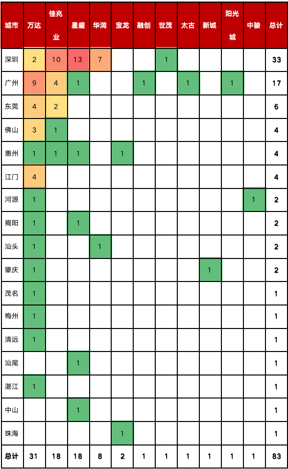 從企業項目分佈來看,萬達佈局數量最多,範圍最廣;佳兆業、星盛擁有本土優勢,在廣深形成「寡頭」效應;華潤高度聚焦深圳,其他企業佈局則較為分散。