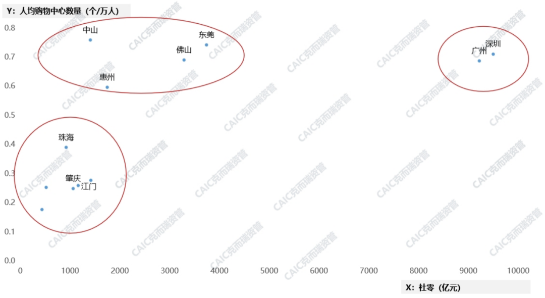從城市人均購物中心數量和社零的對比來看,廣州、深圳社零基本面較好,城市整體商業面積仍未滿足人口消費需求,天花板較高,商業仍有發展空間。而中山、惠州、佛山、東莞市場飽和已顯現,珠海、肇慶、江門仍處於購物中心稀缺階段。