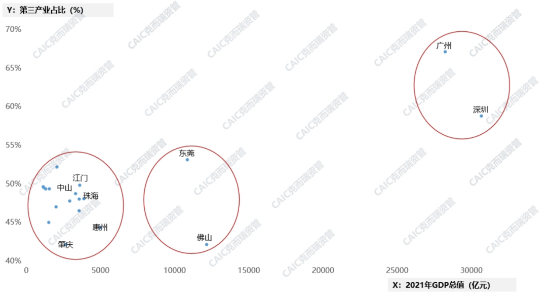 2022年,廣東省「一核一帶一區」區域發展新格局基本確立,其中由韶關、梅州、清遠、河源、雲浮組成的北部生態發展區將嚴格控制開發強度,着力發展現代農業、休閒旅遊、綠色低碳產業,承接發展引擎區產業轉移的可能性較小。我們關注的九個城市雖然定位為廣東省的發展引擎,但廣深仍遠超其他城市,莞佛位於第二梯隊,其他城市均無突出表現,身為「引擎」,未來產業發展仍需提速。