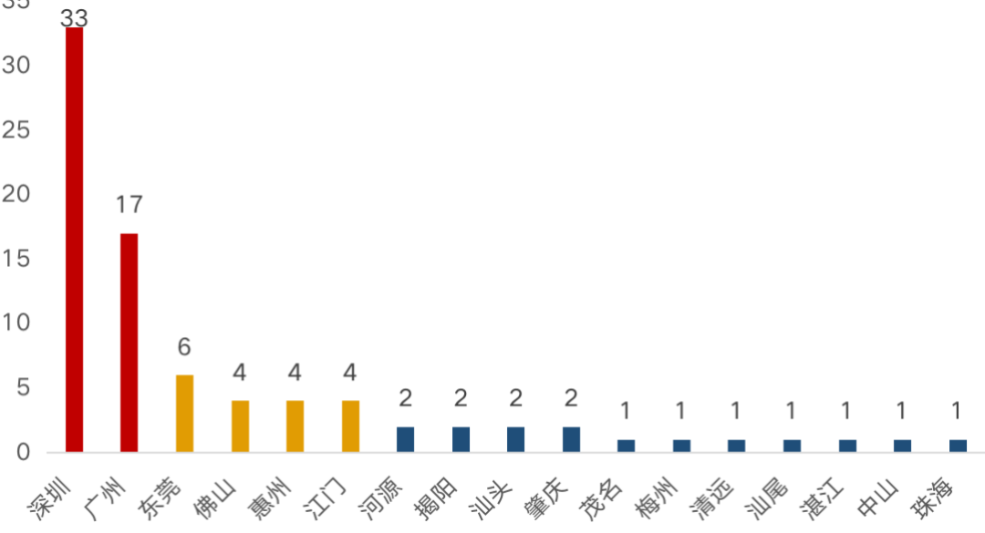 其中深圳數量遙遙領先,廣州位於其后;東莞、佛山、惠州、江門處於第二梯隊,其他城市關注度較低。整體來看熱度集中,深度下沉不夠,廣深「能進則進」,都市圈城市擇機進駐,其他城市「能不進就不進」。