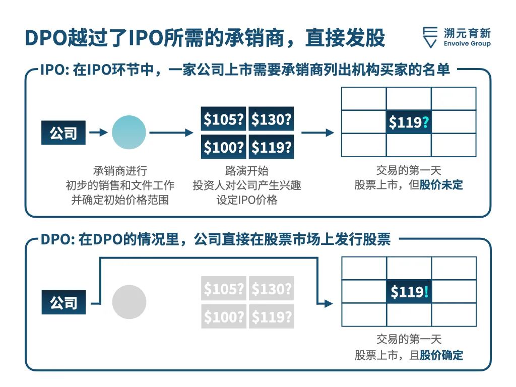 與事先協商股價的IPO不同,在DPO中,股票價格完全聽從市場需求,所以DPO並不適合所有公司,選擇這種方式的公司必須自己吸引公眾,一般都是擁有在市場上聞名遐邇的品牌和商業模式的To C公司,確保投資界瞭解並有興趣購買其股份。