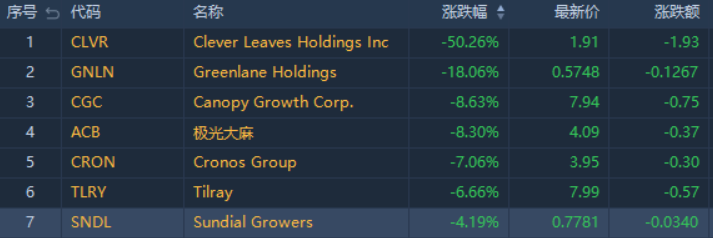 在上周大幅上漲后,投資者獲利了結,大麻股周一均出現下跌。周一美股收盤,Clever Leaves $CLVR 跌50.26%,Greenlane $GNLN 跌18.06%,Canopy Growth $CGC 跌8.63%,Aurora Cannabis $ACB 跌8.30%,Tilray $TLRY 跌6.66%,Sundial Growers $SNDL 跌4.19%。