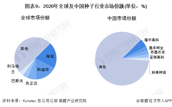 在市佔率方面,根據Kynetec統計的市場規模以及各公司公報數據,2020年,全球種子行業市場中,排名前幾位的公司依次為拜耳、科迪華、先正達集團、巴斯夫、Vilmorin,市場份額依次為20%、16.8%、6.9%、4%以及3.4%。