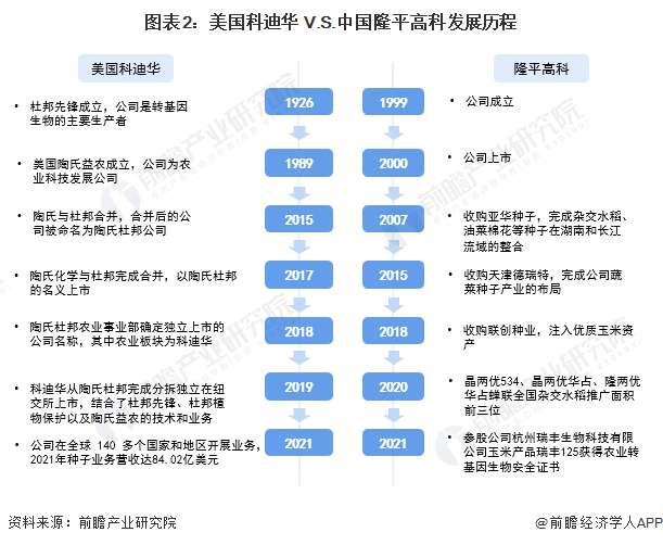 本文核心數據:科迪華和隆平高科發展歷程、產品佈局、財務數據、種子市場競爭格局