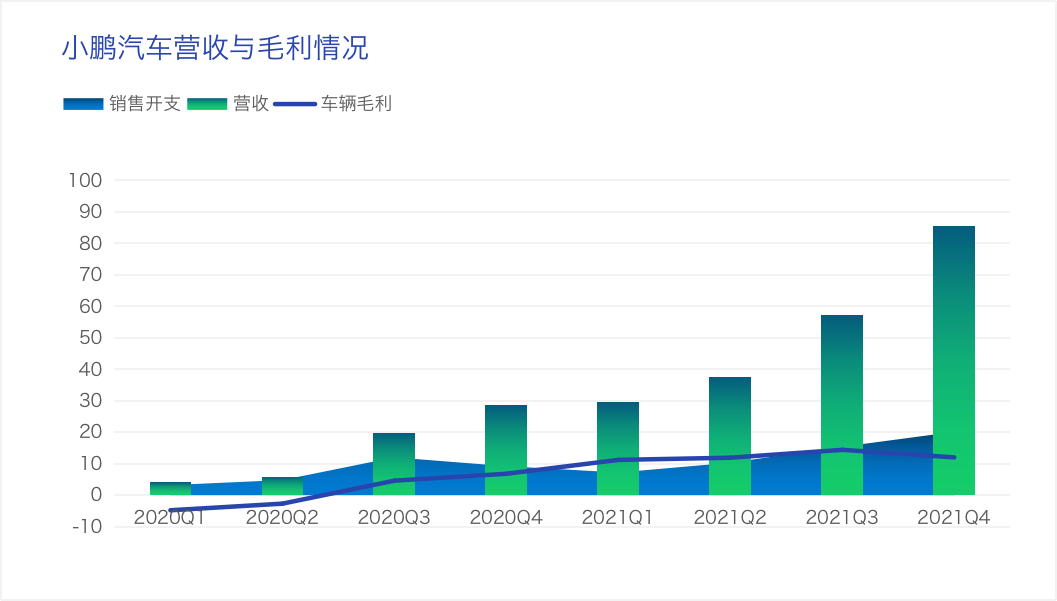 2021年,小鵬汽車營收達209.9億元,同比增長近260%,是「蔚小理」中唯一一家增長超兩倍的企業。有賴於第四季度交付超過4.17萬輛新車,小鵬當季的收入也取得可觀增長,達到86億元。