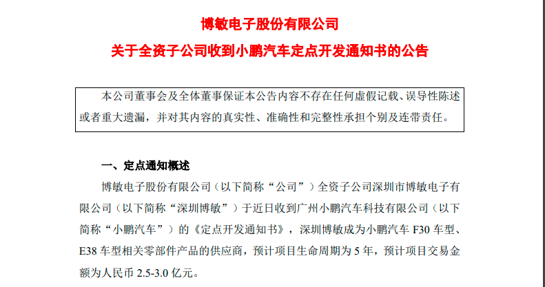 3月22日,博敏電子發佈了一份名為《關於全資子公司收到小鵬汽車定點開發通知書的公告》,表示深圳博敏成為小鵬汽車 F30 車型、 E38車型相關零部件產品的供應商,預計項目生命周期為 5 年,預計項目交易額為人民幣 2.5-3.0 億元。