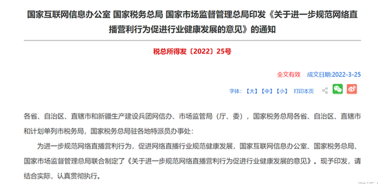 值得注意的是,上述消息是在今日中午流傳出來的,今日下午,國家互聯網信息辦公室、國家税務總局、國家市場監督管理總局聯合制定的《關於進一步規範網絡直播營利行為促進行業健康發展的意見》(以下簡稱《意見》)正式印發。