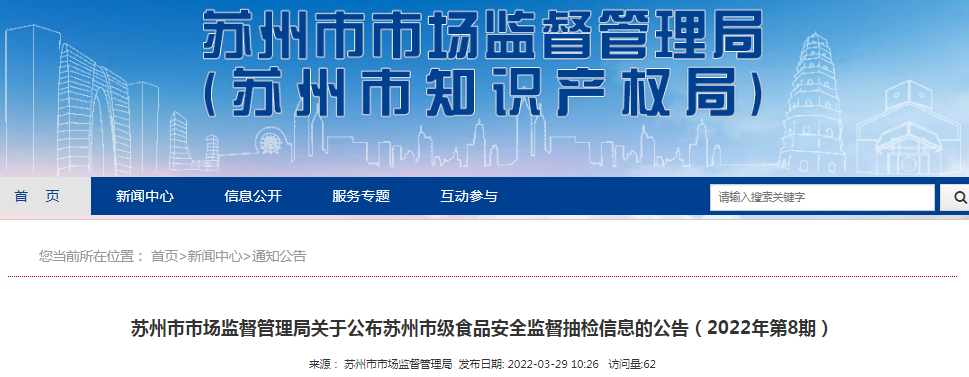 中國質量新聞網訊 近日,蘇州市市場監督管理局發佈蘇州市級食品安全監督抽檢信息的公告(2022年第8期)。本次公告的監督抽檢信息涉及酒類、食用農產品、糧食加工品、肉製品、方便食品5大類食品137批次樣品。檢出食用農產品3批次樣品不合格。
