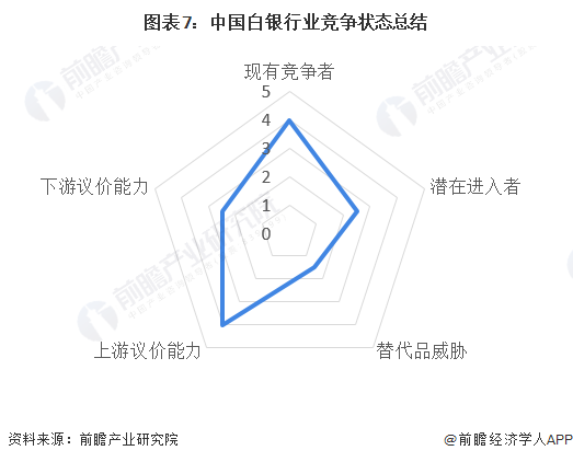 從五力競爭模型角度分析,白銀行業屬於特殊行業,首先其具有價值屬性,其次其良好的工業屬性都決定了其幾乎沒有替代品威脅;而現有競爭者數量較多,但市場集中度在不斷提高;行業上游供應商一般為國家政府,上游對本行業的議價能力較強,下游消費市場則主要是白銀飾品行業或者工業用途,由於該價格主要受全球市場定價,因此下游對本行業的議價能力一般;同時,因行業存在嚴格的准入資質以及資金門檻較高,潛在進入者威脅較小。