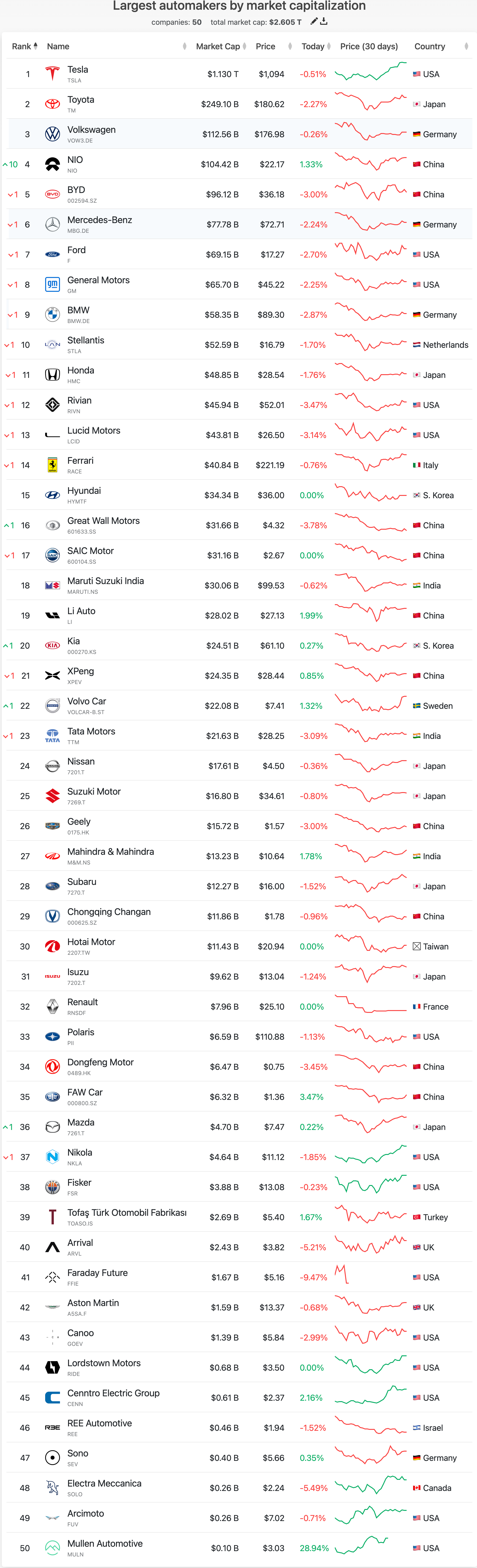 綜上種種,或許能夠解釋為何特斯拉能夠快速登上萬億美元市值的寶座,並穩居如此之久。全球50大車企市值排行中,特斯拉市值穩居第一,達1.13萬億美元;排名第二的是豐田汽車( $TM .N),市值相差甚遠,僅為2491億美元。這50達車企的總市值為2.605萬億美元,而特斯拉一家車企就接近佔了一半的市值!