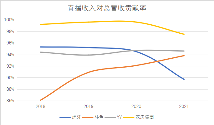 從2018年至2021年,虎牙的直播收入對總營收的貢獻率分別高達95.3%、95.2%、94.5%和89.7%。同期,鬥魚的直播收入對總營收的貢獻率分別為86.1%、90.9%、92.2%和93.8%。兩家平臺在業績報告中亦表示,其收入主要來源於虛擬禮物的銷售。