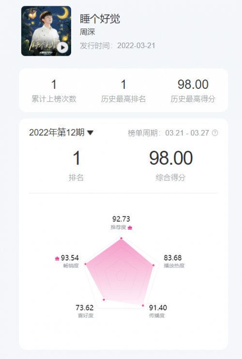 騰訊音樂榜一直在呼喚音樂初心的迴歸。由你榜依託用户聽歌大數據,反映華語樂壇最新的歌曲熱度,榜單評比規則公開透明,數據來源真實可靠,分數計算方法嚴謹科學,以數據見證真流行。歌手周深的《睡個好覺》上榜僅一周就登頂由你榜第12期(03.21-03.27)榜首,播放指數、傳播指數、喜好度、人氣指數、付費指數綜合評價分98分。音樂行業的資深研究者認為「從數據維度提供的音樂評價量化指標,客觀公正更容易讓人信服」。