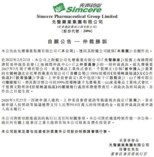 近期,在港上市的先聲藥業(02096.HK)披露先聲藥業在收購北京託畢西藥業有限公司(簡稱「託畢西藥業」)100%股權的糾紛中仲裁勝訴,託畢西藥業100%股權必須轉讓予先聲藥業。