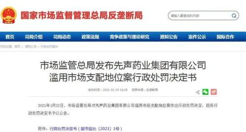 由於先聲藥業的行為違反了《反壟斷法》,2021年1月22日被市場監管總局處以1.007億的罰款。2021年1月29日,先聲藥業公告稱,基於處罰的金額,公司認為有關事件及行政處罰不會對本公司的業務經營及財務狀況產生任何重大影響。
