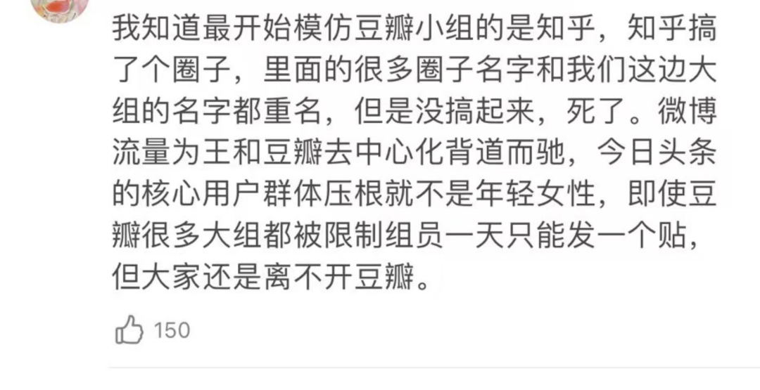 另一位資深用户回憶:「我知道最開始模仿豆瓣小組的是知乎,知乎搞了個圈子,很多和我們的組名一樣,但是沒搞起來。微博流量為王和豆瓣去中心化背道而馳,今日頭條的核心用户羣體壓根不是年輕女性,即使豆瓣很多大組都被限制組員一天只能發一個帖,大家還是離不開豆瓣。」