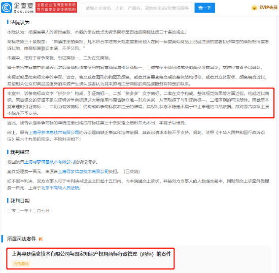 【#拼多多訴爭拼夕夕商標被駁回# 法院:因與「拼多多」相似】企查查APP顯示,近日,拼多多關聯公司上海尋夢信息技術有限公司與國家知識產權局商標行政管理(商標)行政一審判決書公佈。涉案商標為「拼夕夕」,申請註冊號48664087。文書顯示,法院認為,訴爭商標由文字「拼夕夕」構成,引證商標一、二系「拼多多」文字商標,二者在文字構成、整體視覺效果等方面近似,構成近似商標。裁判結果為,駁回原告上海尋夢信息技術有限公司的訴訟請求。#拼多多訴爭拼夕夕商標被法院駁回#