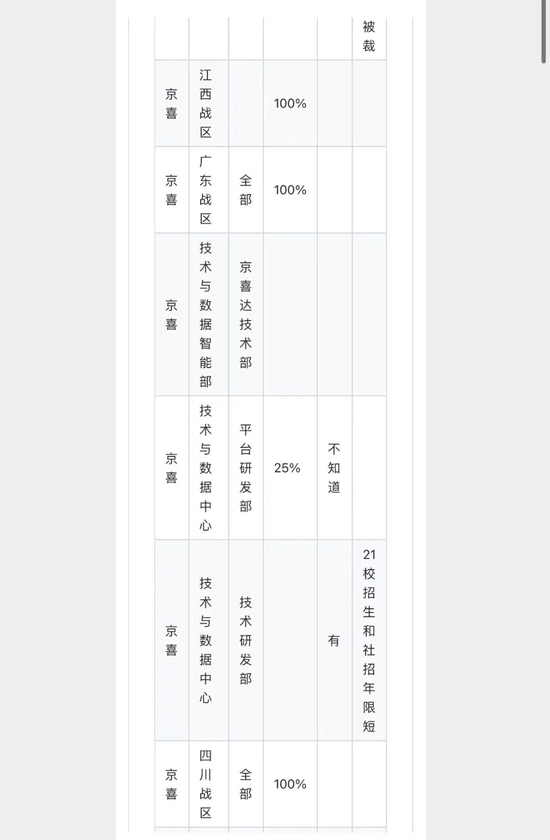 京喜也是裁員較多的業務。一位京東員工向第一財經提供了一份關於京喜裁員的截圖。截圖顯示,京喜廣東戰區、四川戰區和江西戰區裁員比例為100%。此外,京喜平臺研發部裁員25%,技術研發部也有部分裁員。