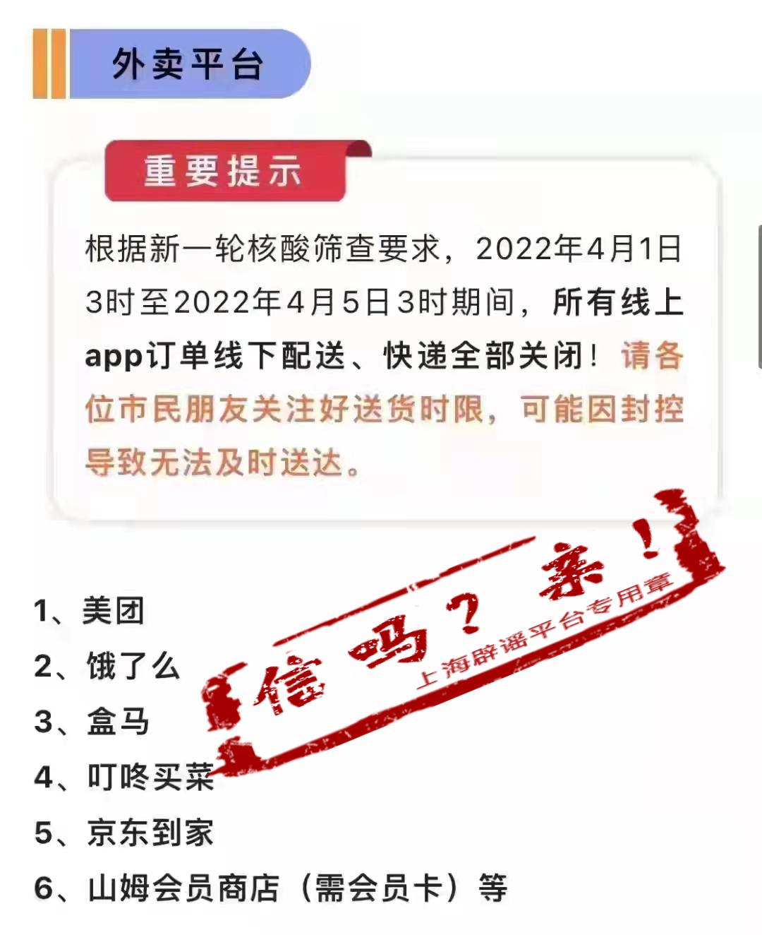 這些天,買菜、買藥、外賣仍舊是市民最關心的話題。3月30日,一條「4月1日3時至2022年4月5日3時期間,所有線上app訂單線下配送、快遞全部關閉」的通知很受關注。該通知稱,美團、餓了麼、盒馬、叮咚買菜、京東到家、山姆會員商店等提供「線上下單、線下配送」的app都將停止運行。上海闢謠平臺很快查清,該通知並非覆蓋全市,而是出自松江區佘山鎮。