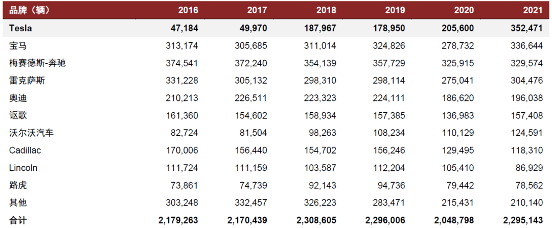 圖表3:2016-2021年美國豪車分品牌銷售情況