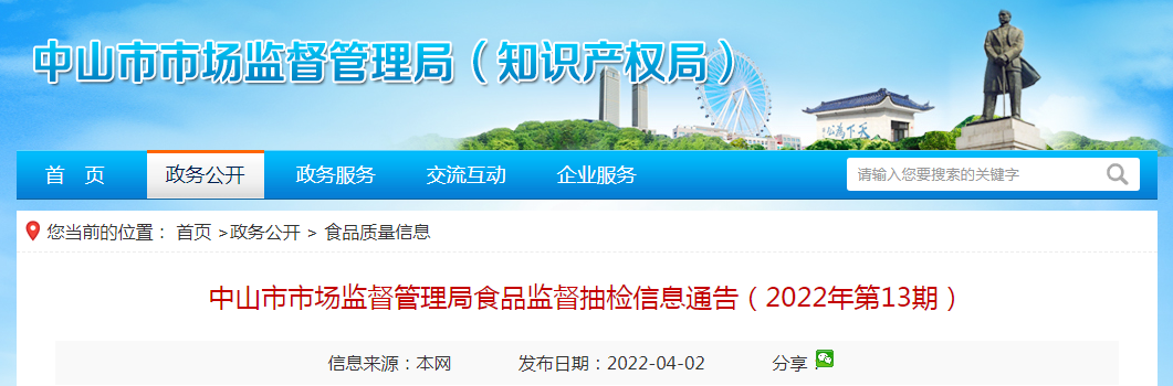 中國質量新聞網訊 4月2日,廣東省中山市市場監督管理局網站發佈食品監督抽檢信息通告(2022年第13期)。本期對中山市範圍內食品經營生產環節的五大類食品進行監督抽檢,具體包括餐飲食品、酒類、糧食加工品、肉製品和食用農產品共105批次,合格樣品101批次,不合格樣品4批次。檢驗依據按照《廣東省食品安全監督抽檢實施細則》執行。
