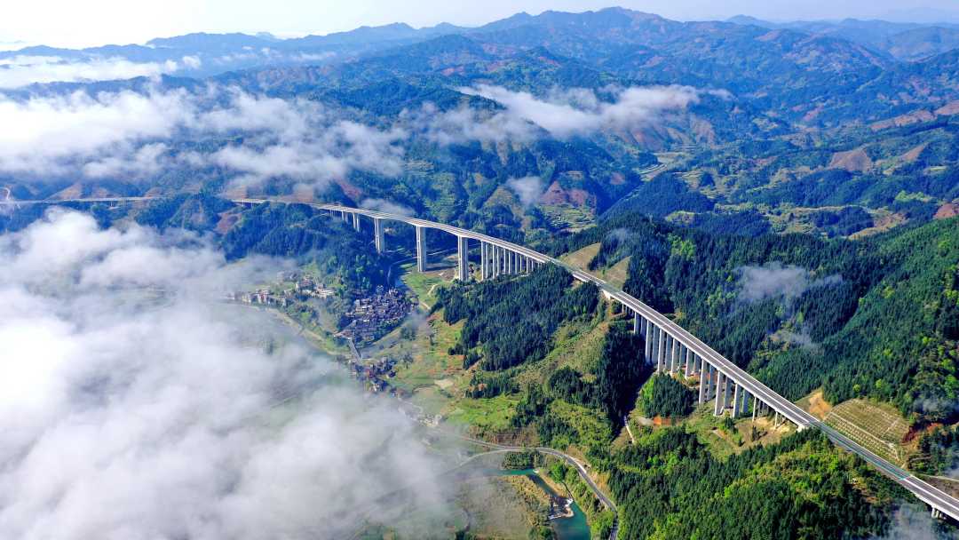 4月3日,在貴州省黔東南苗族侗族自治州劍榕高速榕江縣境內的寨蒿鎮烏公特大橋周邊雲霧繚繞,美景如畫。當日,榕江縣雨過天晴,劍榕高速公路榕江縣境內的寨蒿鎮烏公特大橋雲霧縹緲,變幻多姿,美景如畫。近年來,榕江縣搶抓機遇,攻堅克難,全縣人民出行日益便捷,便捷交通助力當地經濟騰飛。