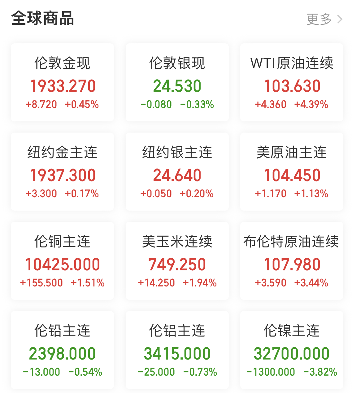 紐約商品交易所6月交割的黃金期貨價格上漲10.30美元,漲幅為0.5%,收於每盎司1934美元。上周該期貨累計下跌1.6%。5月白銀期貨價格小幅下跌6美分,跌幅為0.3%,收於每盎司24.59美元。上周該期貨累計下跌近3.8%。