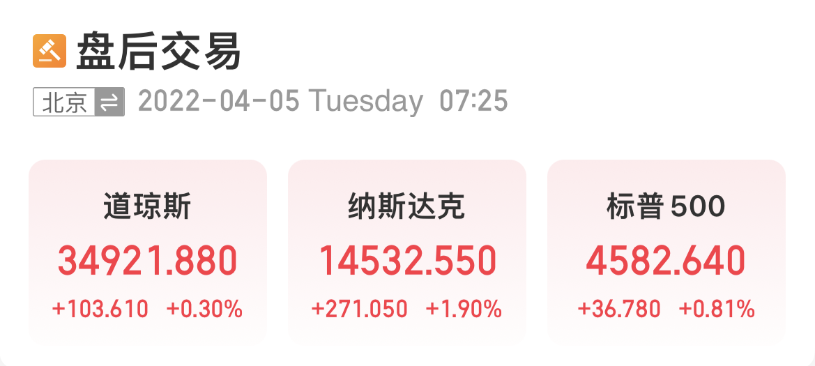 北京時間5日凌晨,美股周一收高,科技與通訊板塊領漲,納指上漲1.9%。美國2年期與10年期國債收益率再次倒掛。德國稱西方國家將在未來幾天對俄羅斯實施更多制裁。中概股大漲。道指漲103.61點,漲幅為0.30%,報34921.88點;納指漲271.05點,漲幅為1.90%,報14532.55點;標普500指數漲36.78點,漲幅為0.81%,報4582.64點。