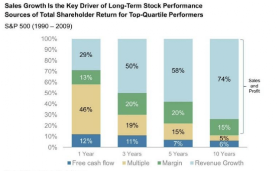 在我們進入Adobe的估值之前,重要的是要提醒自己,銷售增長是長期股票表現的關鍵驅動因素。現金流,倍數當然很重要,但在十年的時間里,銷售增長對股票表現的影響最大。