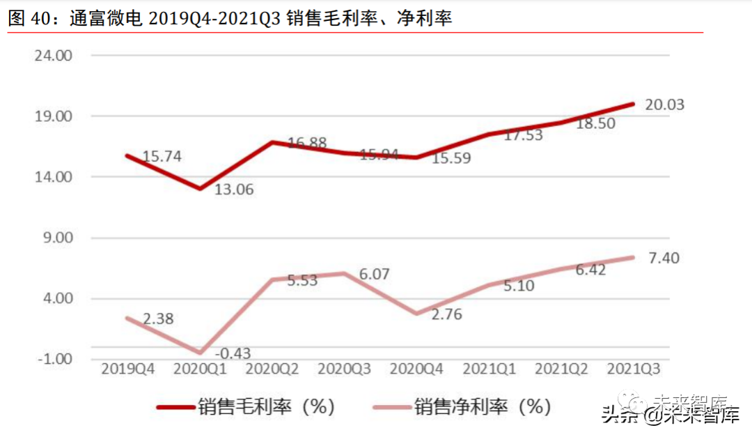 公司簡介。公司成立於 1994 年,並於 2007 年在深交所上市,總部位於江蘇南通。公司 主營業務為集成電路封裝與測試,持續在高性能計算、5G 通訊產品、存儲器和顯示驅動 等領域佈局,並於 AMD、聯發科、卓勝微、長鑫存儲等國內外細分領域頭部客户保持緊 密合作,在 SoC、MCU、電源管理、功率器件和天線通訊產品等高成長領域持續深耕。以 AMD 為例,公司與 AMD 形成「合資+合作」的模式,2020 年超過 50%收入來自 AMD。根據芯思想研究院(ChipInsights)發佈的 2021 年全球封測十強榜單,通富微電 2021 年 預估營收為 145.37 億人民幣,同比增長 34.99%,營收規模在全球前十大 OSAT 中位列第 五,在中國大陸位列第二。